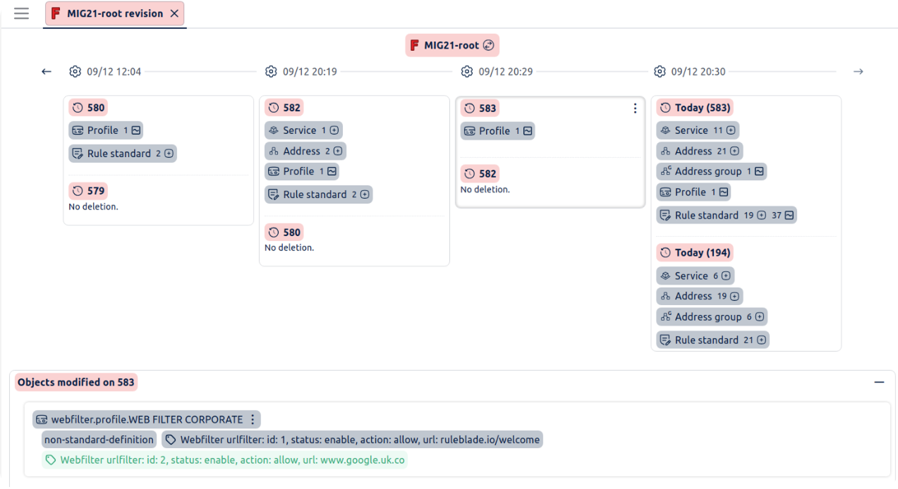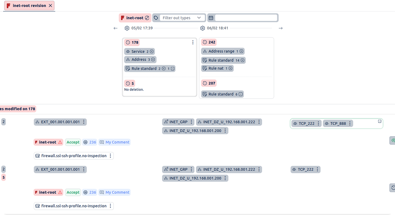Each revision generates a detailed difference report, enabling bulk searches, post-mortem analysis, shadow IT detection, and one-click rollbacks.