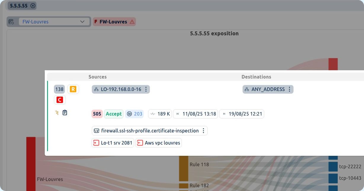 Flexibilité au cœur de l’application : des vues d’exposition directement reliées à vos règles Firewall, qui pilotent vos revues et vous offrent la possibilité de générer instantanément de nouvelles actions.
